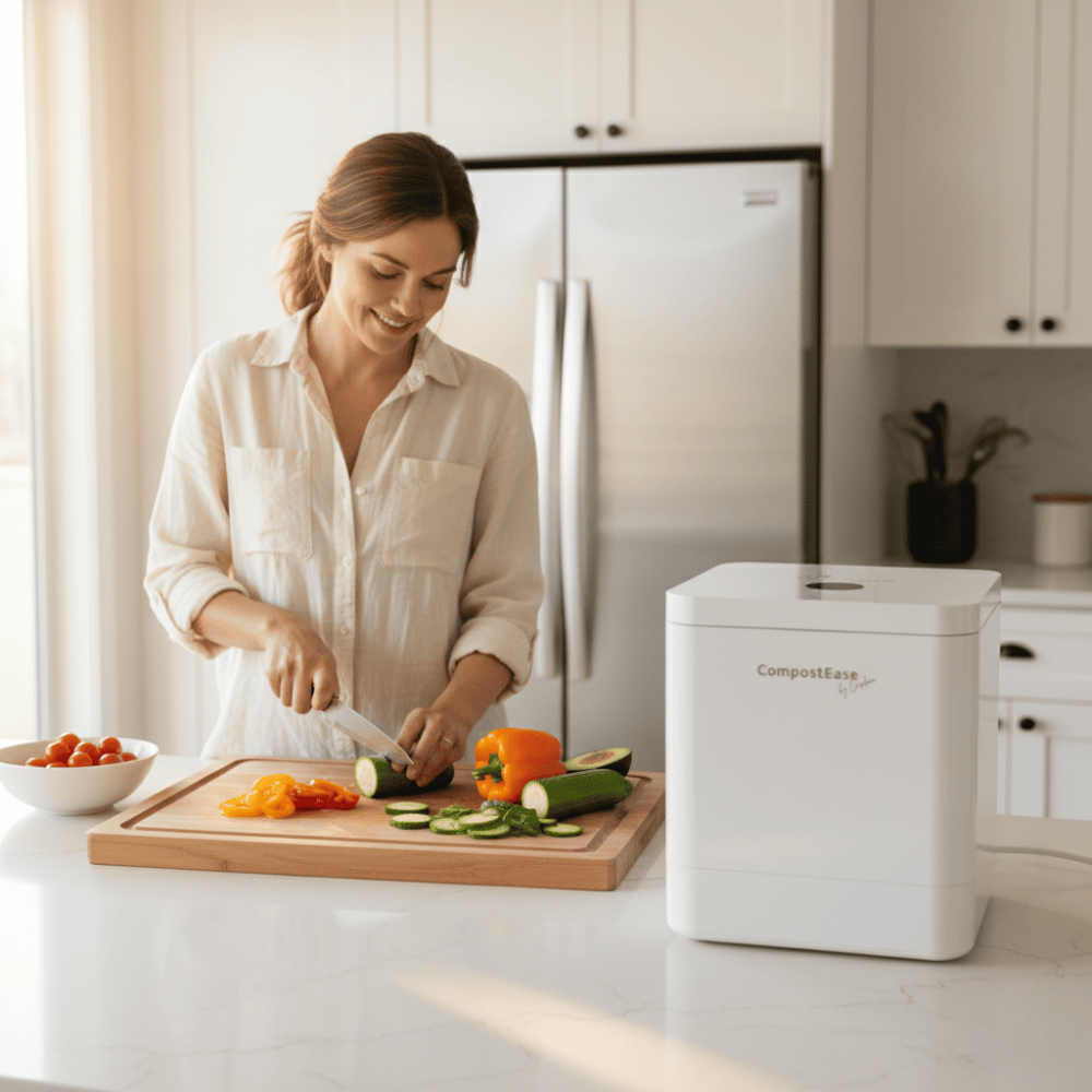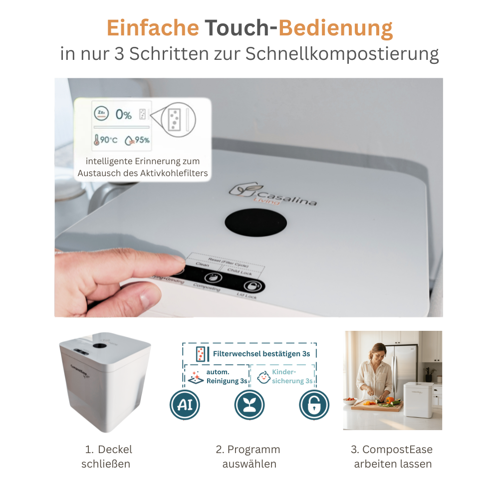 Mit dem CompostEase beginnt ein neues Zeitalter im Haushalt. Erlebe, wie mühelos und geruchsneutral aus deinen Küchenabfällen wertvoller, nährstoffreicher Dünger entsteht. Dein smarter Beitrag für eine bessere Umwelt und dein Portemonnaie – einfach auf Knopfdruck.