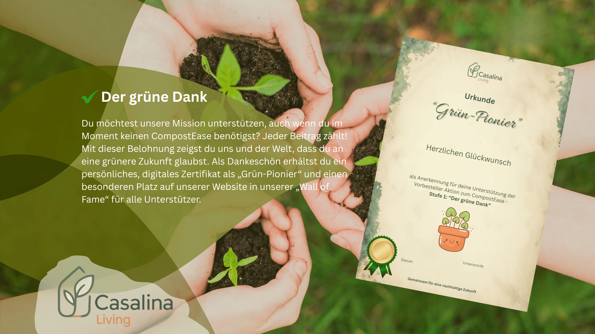 Mit Deiner Unterstützung für nur 5 € zeigst Du Dein Engagement für eine grünere Zukunft und hilfst uns, den CompostEase zu realisieren. Als Dankeschön erhältst Du: