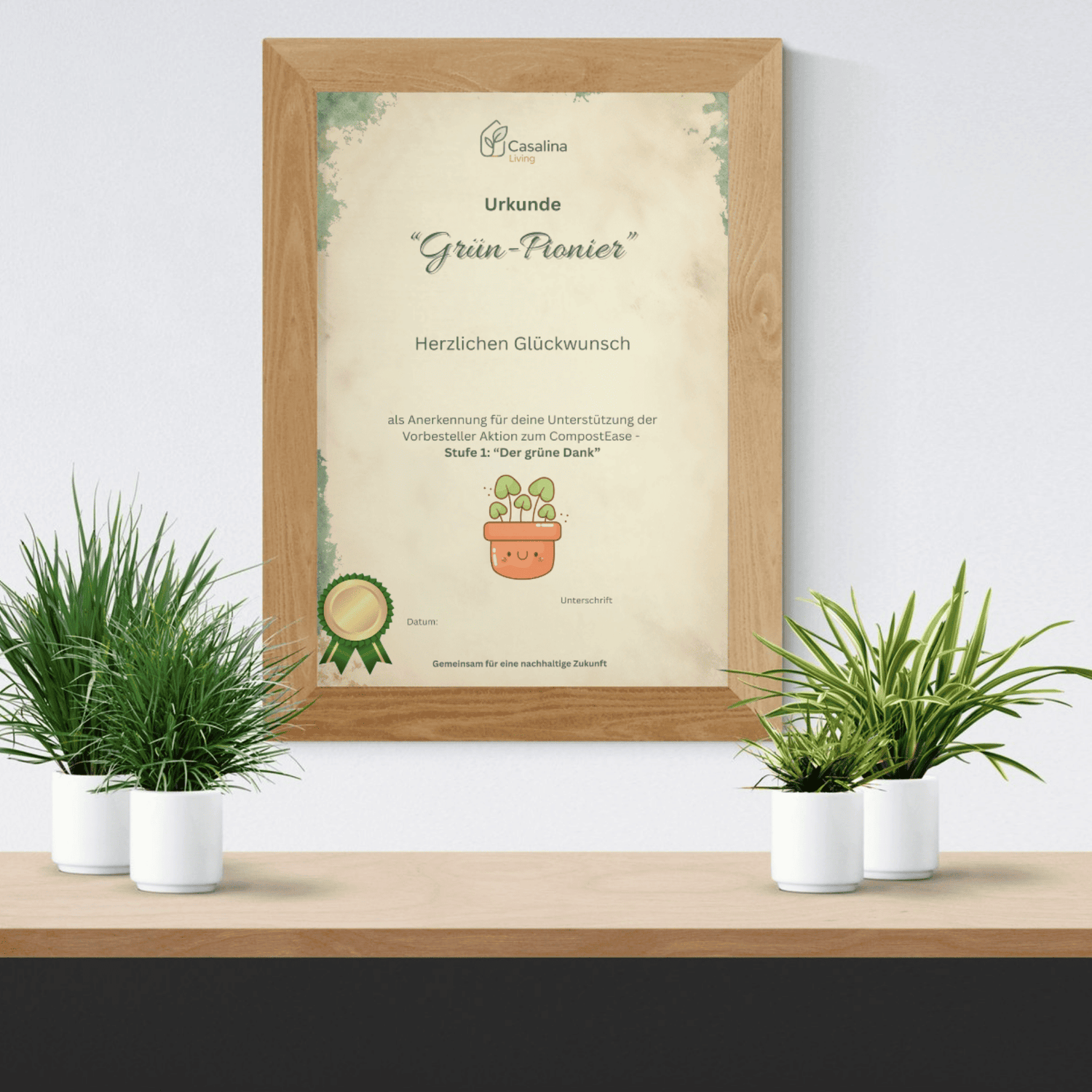 Mit Deiner Unterstützung für nur 5 € wirst Du zu einem wichtigen Teil der Casalina Living Familie. Du hilfst uns nicht nur, den CompostEase zu realisieren, sondern trägst aktiv dazu bei, das Bewusstsein für nachhaltige Küchenpraktiken zu schärfen. Dein Beitrag ist ein klares Statement für eine umweltfreundlichere Zukunft und ein Zeichen Deiner Überzeugung, dass jeder Einzelne einen Unterschied machen kann. Wir sind stolz darauf, Dich als Teil unserer Bewegung begrüßen zu dürfen und freuen uns darauf, gemeinsam mit Dir diesen Weg zu gehen.